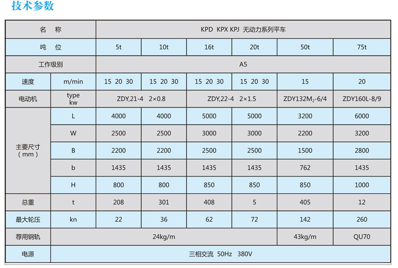 電動平車是一種有軌廠內運輸車輛,具有結構簡單,載重量大,耗能小,使用方便,維修容易,不污染環境等優點,廣泛用于機器制造,造船,冶金等工廠作為配合吊車運移重物過跨之用。電動平車分KPJ拖纜系列、KPD低壓供電和KPX蓄電池供電的電動平車三種,這三種平車的高度低,臺面強度好,維修方便,可以在彎道或直道上長距離運行,也可實現遙控地面控制,給廠區運輸、搬運以很大的方便。