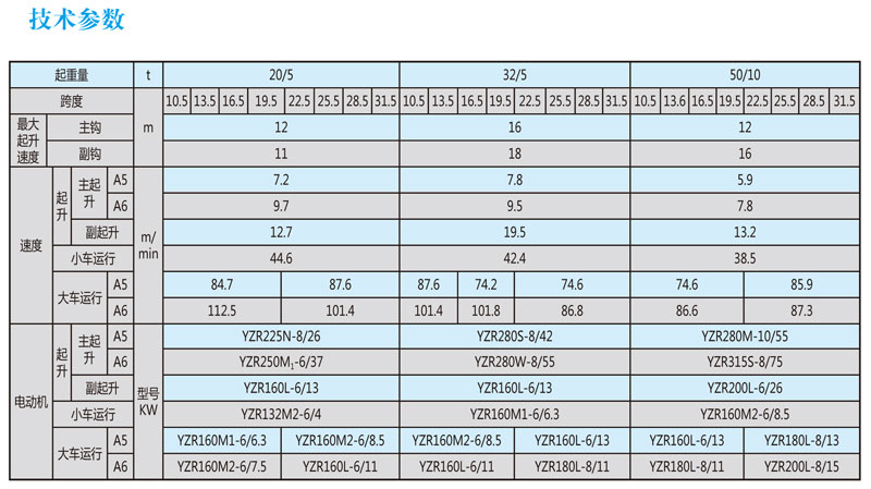 QD型吊鉤橋式起重機(jī),主要由橋架、大車(chē)運(yùn)行機(jī)構(gòu)、小車(chē)、電器設(shè)備等組成。根據(jù)使用頻繁程度不同,分為A5、A6兩種工作級(jí)別。起重量為5-120T,跨度為7.5-35.5米,工作級(jí)別為A5—A6,工作環(huán)境溫度為-25℃--40℃。
